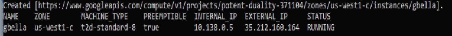 gcloud compute instances create gbella --machine-type=t2d-standard-8 --network-interface=network-tier=STANDARD,nic-type=GVNIC,subnet=default --metadata=enable-oslogin=true --no-restart-on-failure --maintenance-policy=TERMINATE --preemptible --provisioning-model=SPOT --instance-termination-action=STOP --create-disk=auto-delete=yes,boot=yes,device-name=gbelladisk,image=projects/ubuntu-os-cloud/global/images/ubuntu-minimal-2004-focal-v20221202,mode=rw