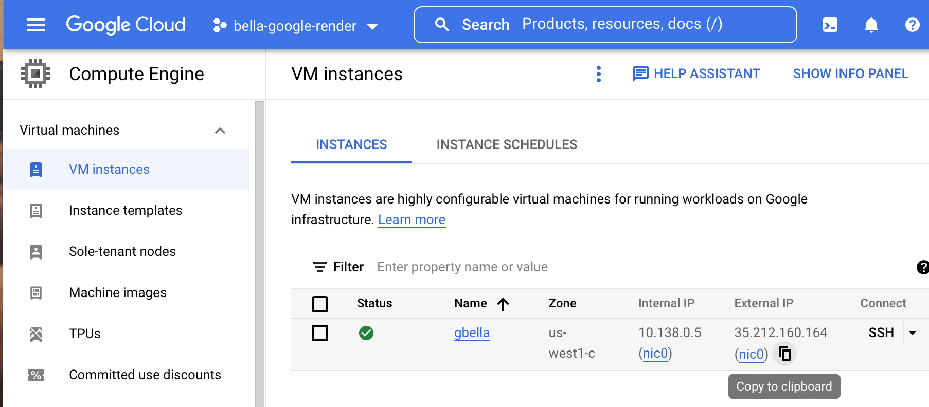 Make a note of the External_IP that Google assigns to your vm. Wait half a minute for Linux to boot. While you are waiting, head over to the GCP browser Console and the VM Instances page you visited earlier and you should see the gbella vm.