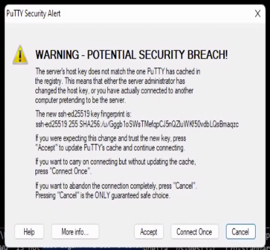 Occasionally you will get this popup with Windows and a similar one on Mac. The reason is that ssh/sftp store the digital fingerprint all servers you visit. This warning means the machine looks different than the last time you connected to this particular IP address. Since we are using randomly assigned ephemeral internet IP addresses, the cycle of make/destroy vms will lead to a future situation where Google recycles an IP address you visited before but the vm it points to is freshly minted and has a new fingerprint. If we were using ssh/sftp passwords you would need to proceed cautiously since long running servers don't suspiciously change their identities midstream. This is called the 'phishing' technique to steal your passwords but since we are using pki (and on macOS a local passphrase), our authentication secrets never leaves your desktop machine.
